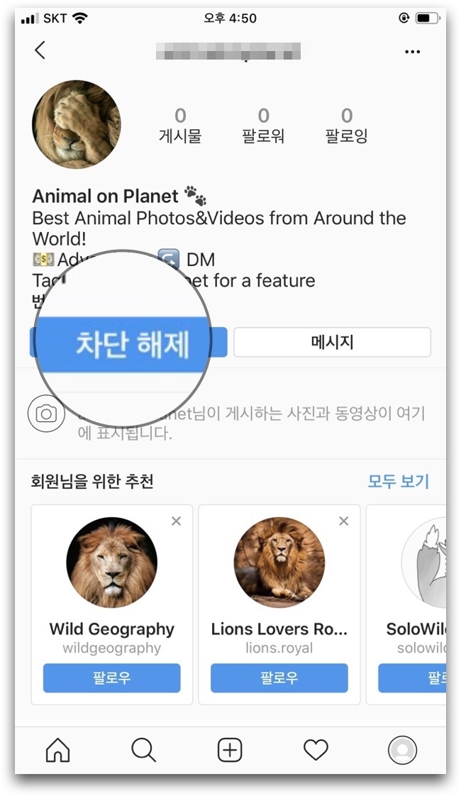 메시지 좌측 "차단 해제" 버튼 탭. "~님을 차단 해제할까요?" 인스타그램 알러트 팝업 "차단 해제" 눌러 해제 완료하기. 해제가 완료되고 새로고침을 하면 해제된 사용자의 사진, 동영상 피드가 나타난다.