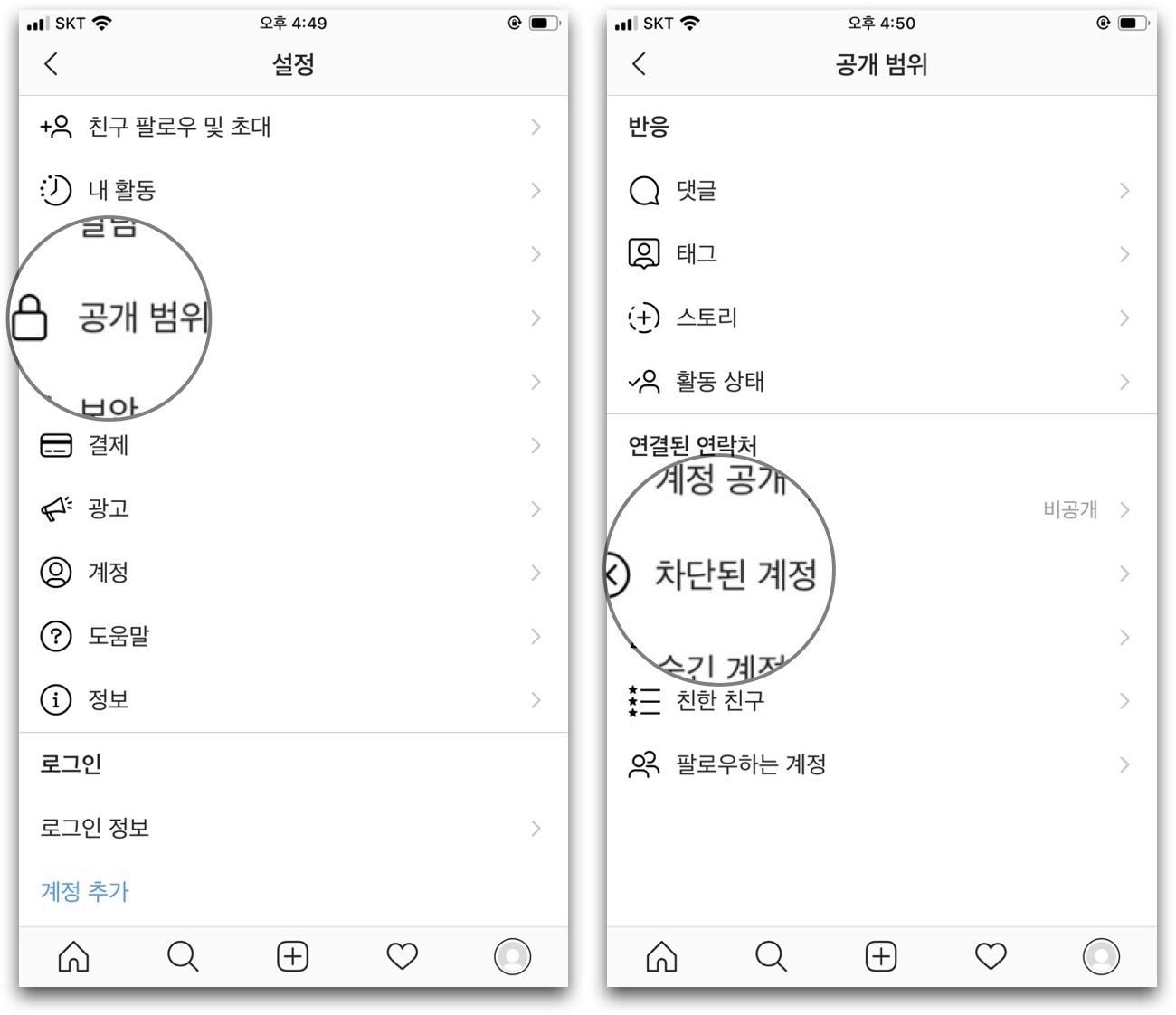 - 설정 "공개 범위", 연결된 연락처에 "차단된 계정" 탭