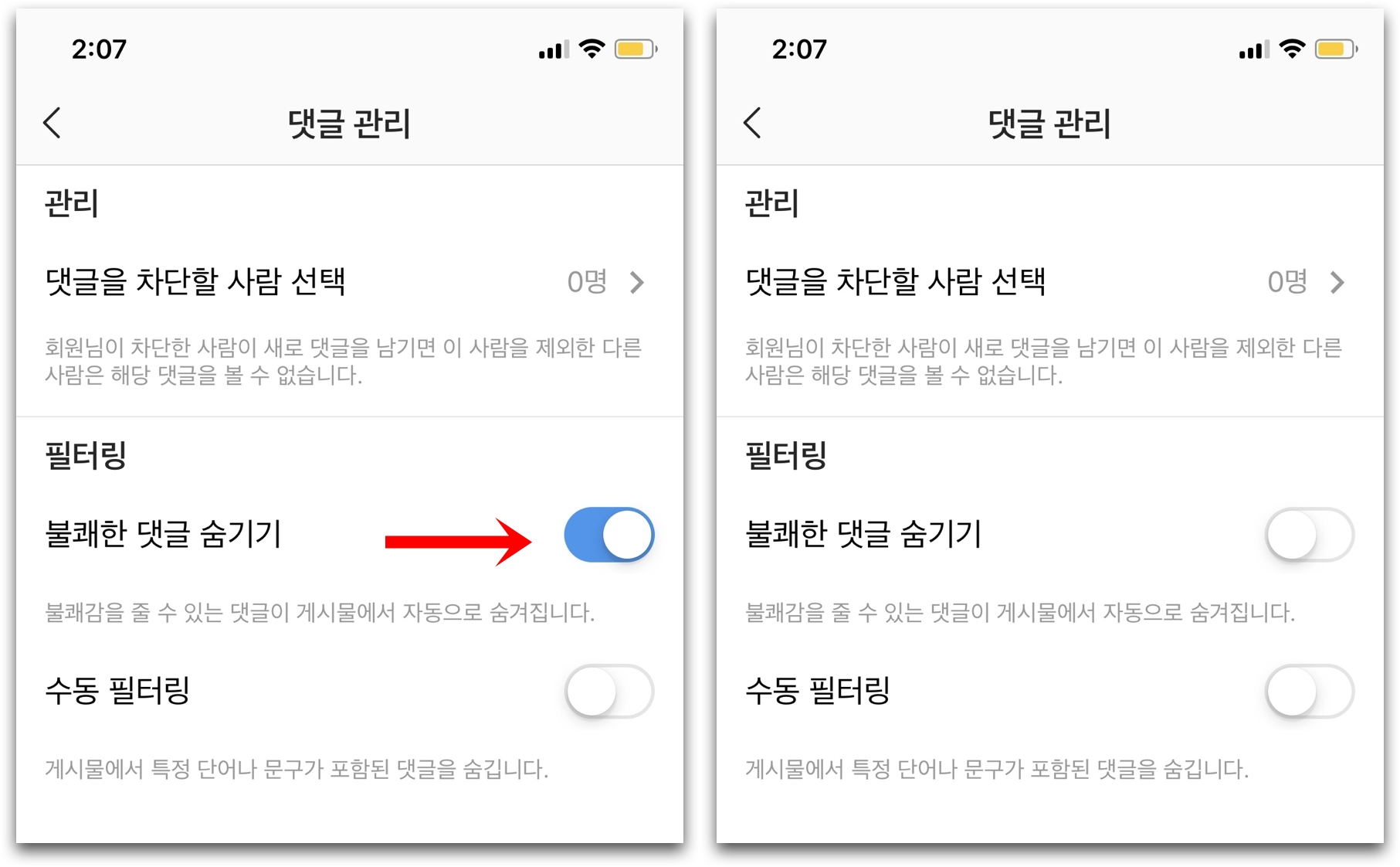 Step 5. 필터링 항목 활성화된 "불쾌한 댓글 숨기기" 스위치 눌러 비활성화하기